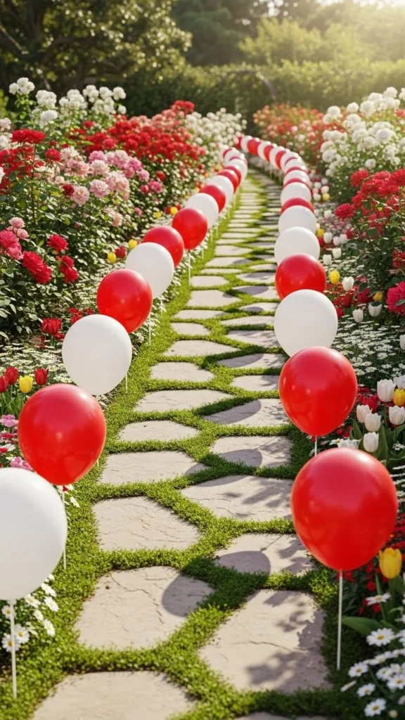 Mark walkways with balloon stakes outdoors. Use double balloons for stability. Keep spacing consistent. This idea guides guests while adding color. Outdoor balloon markers feel welcoming and photograph well in daylight.