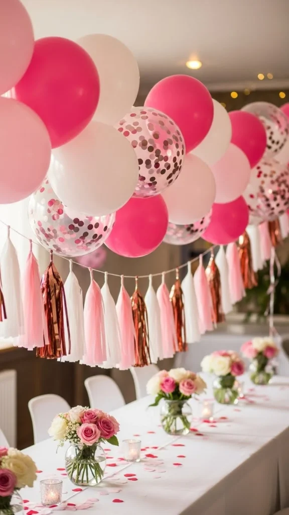 Combine balloons with tassels for texture contrast. Hang tassels slightly lower than balloons. Keep colors coordinated. This works well for ceilings and doorways. Mixed textures add richness without extra cost.