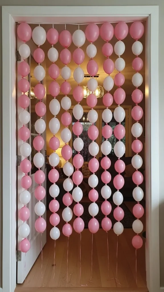 String balloons vertically to create a curtain effect. Keep spacing even. This works well between rooms or as a backdrop. Balloon curtains add movement as guests pass through.
