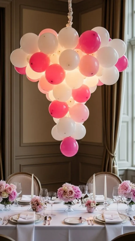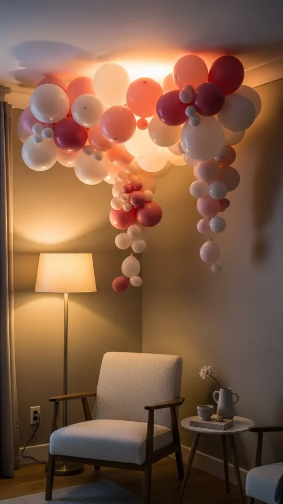 A balloon chandelier feels whimsical and eye-catching. Cluster balloons together and suspend them using a clear fishing line. Keep the shape loose rather than perfectly round. Hang it low enough to feel intentional but high enough to avoid bumps. This works best above tables or seating areas. Suspended balloon decor creates visual drama with minimal materials. Pair with soft lighting for depth.