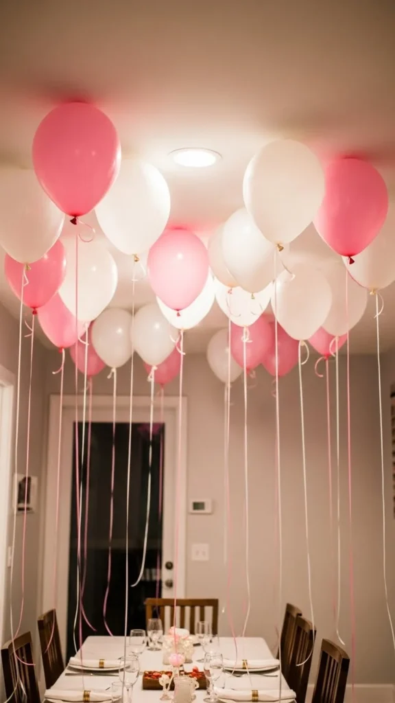 Ceiling balloon clusters add movement without crowding the floor. Helium balloons work best here, but air-filled balloons taped to the ceiling also do the job. Use curling ribbon or satin ribbon for a softer drop. Keep ribbon lengths uneven for a relaxed look. Stick to two or three colors so the ceiling doesn’t feel busy. This idea works especially well over dining tables or dessert spreads. If helium is costly, inflate balloons with air and tape ribbon ends directly to the ceiling using removable hooks. Clear tape keeps things discreet. Metallic ribbons reflect light and add sparkle at night. Floating clusters bring instant celebration energy without blocking walking space. Pair them with simple table decor so the eye naturally travels upward.