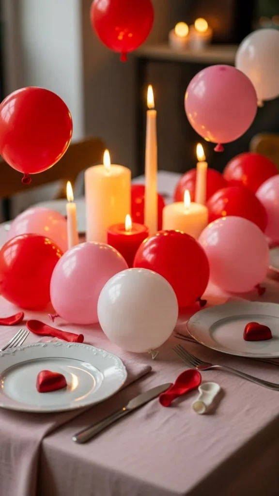 A heart-shaped balloon arch sets the tone the moment guests walk in. It frames doorways beautifully and works well for home parties or small venues. Mix matte and glossy balloons to avoid a flat look. Keep the palette tight for visual calm. Pink, red, and white always read festive without feeling heavy. Use a fishing line to control spacing and shape. Balloon strip tape helps beginners get clean curves. For a budget setup, skip the greenery and rely on balloon size variation instead. Place larger balloons at the base and smaller ones near the top. Soft lighting nearby adds glow without harsh shadows. This setup works great as a photo spot. Add a small rug or side table below to ground the scene. Heart-shaped arches feel playful yet romanticperfect for Valentine gatherings that lean fun rather than formal.