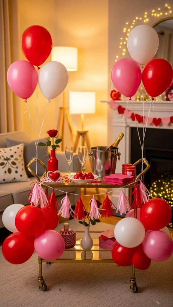 Letter balloons are simple but bold. Spell out short words to avoid clutter. “LOVE” works best for Valentine parties. Mount foil balloons with removable adhesive hooks to protect walls. Surround them with smaller latex balloons for balance. Keep spacing even so letters read clearly in photos. This setup works well in apartments or rentals. If foil balloons stretch your budget, cut letters from cardboard and frame them with balloons instead. Bold lettering adds clarity and charm without much effort. Place seating or a console table below to anchor the wall visually.