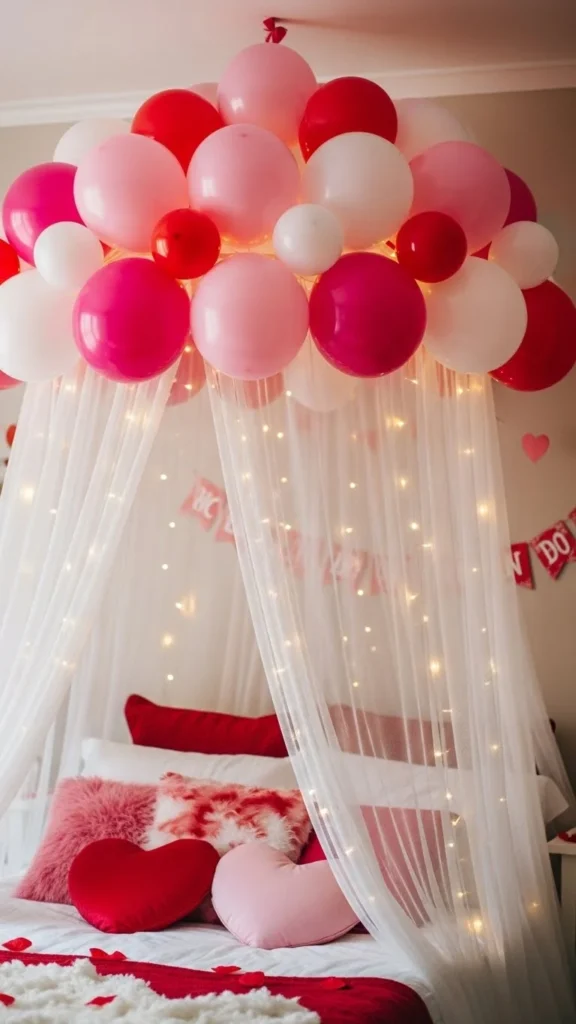 A balloon bed canopy adds charm to Valentine sleepovers. Attach balloons to sheer fabric draped from the ceiling or wall hooks. Keep balloons lightweight and evenly spaced. Add fairy lights behind the fabric for glow. This idea works well for kids’ parties or themed nights. For safety, keep balloons well above sleeping height. Canopy setups feel cozy and fun without permanent changes. Stick to soft colors so the room feels calm rather than busy. Remove balloons easily once the event ends.