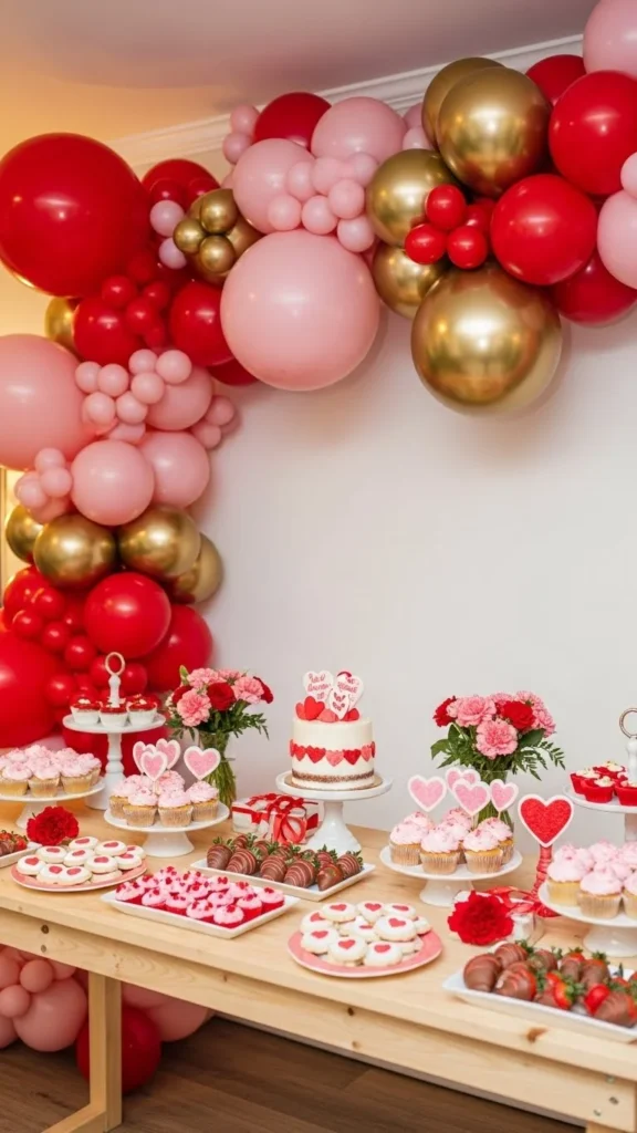 A balloon garland behind the dessert table creates a clear focal point. Keep the garland asymmetrical for a relaxed party feel. Use balloon sizes ranging from 5 to 12 inches to add depth. Attach the garland to a curtain rod or command hooks for easy setup. Gold or metallic accents break up solid colors nicely. For smaller spaces, run the garland only along one side of the table instead of fully framing it. Budget-friendly tip: use fewer balloons but vary sizes more. That creates richness without extra cost. Dessert backdrops double as photo areas, so keep plates and packaging tidy. Warm lighting from one side brings out balloon texture and makes sweets look more tempting.