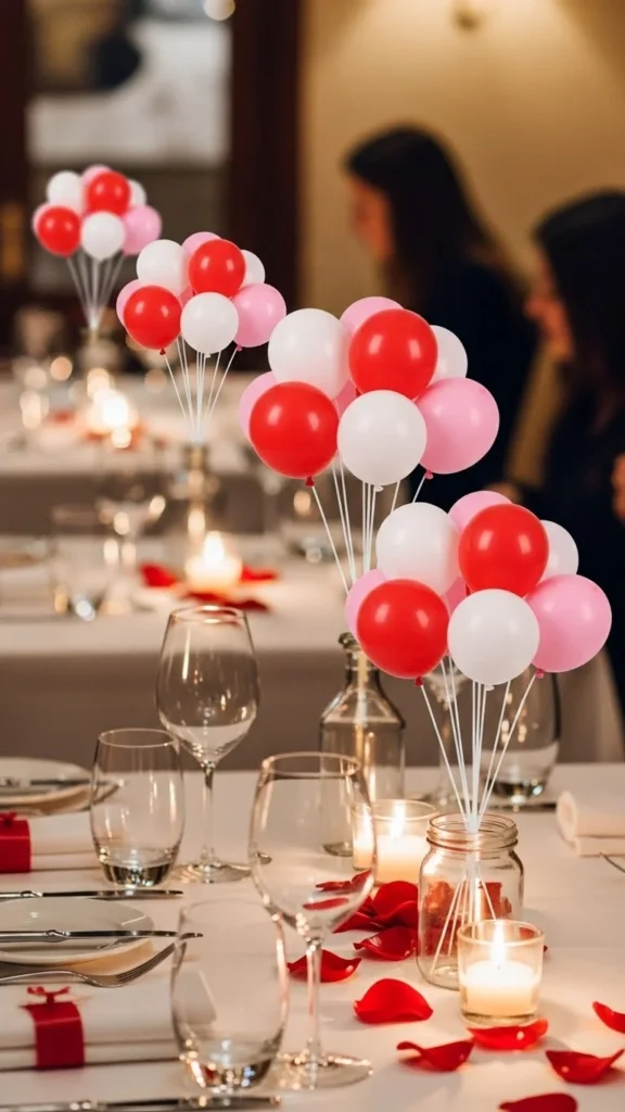 Scatter mini balloons across tabletops for subtle charm. Keep them air-filled so they stay put. Pair with candles or confetti sparingly. Tabletop scatters add color without blocking space.