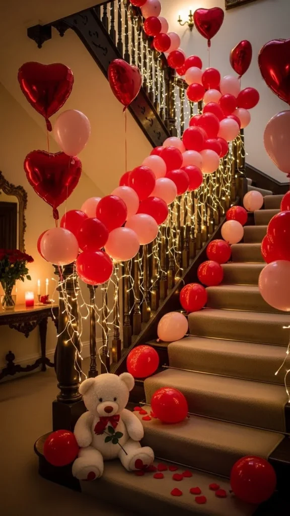 Decorating staircases adds drama without cluttering rooms. Tie balloons along the railing at even intervals. Use lightweight balloons so they don’t droop. Keep the color palette simple to avoid visual overload. This idea works well for entry staircases during parties. Staircase balloons guide guests naturally and feel festive without blocking steps. Avoid placing balloons on walking surfaces for safety.