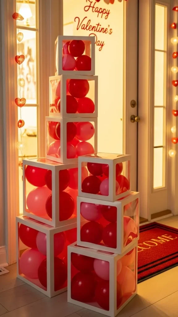 Clear boxes filled with balloons create a modern look. Stack them vertically for height. Use uniform balloon sizes for a clean finish. These boxes double as signage stands if you add letters on the outside. Structured balloon displays feel playful yet tidy. This idea suits modern homes and event halls.