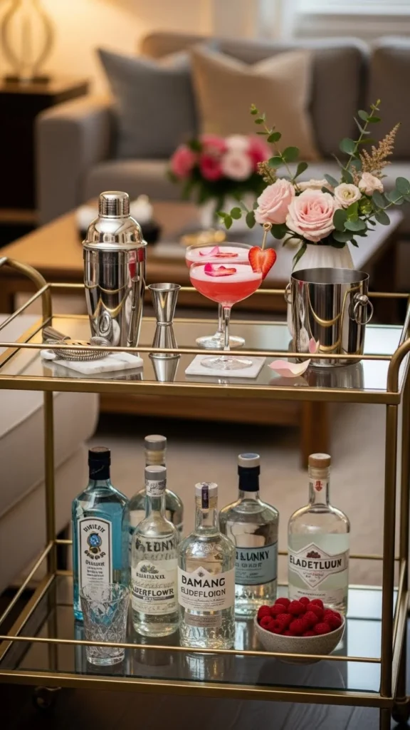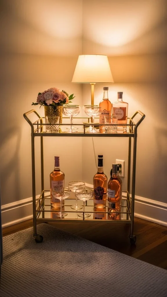 A blush-and-gold bar cart feels romantic without looking overdone. Start with a simple metal cart and layer color through accessories instead of furniture. Pink glassware, rose-tinted bottles, and pale napkins set the tone fast. Gold finishes add instant warmth and pair well with candlelight. If your cart is chrome, wrap handles with removable gold vinyl for a quick switch. Keep drinks limited to two signature cocktails to avoid clutter. Stack books or a marble board on the bottom shelf to ground the look. Battery candles work well for homes with kids or pets. For a budget win, spray-paint thrifted trays and let them cure fully before use. Add one floral element only, like a single stem in a bud vase, so the cart stays tidy and easy to serve from.