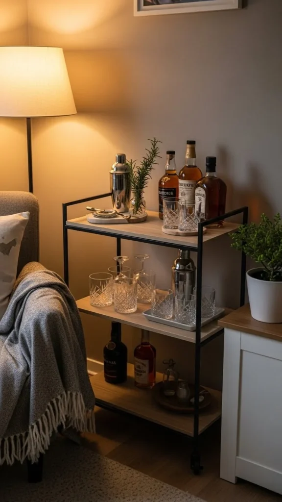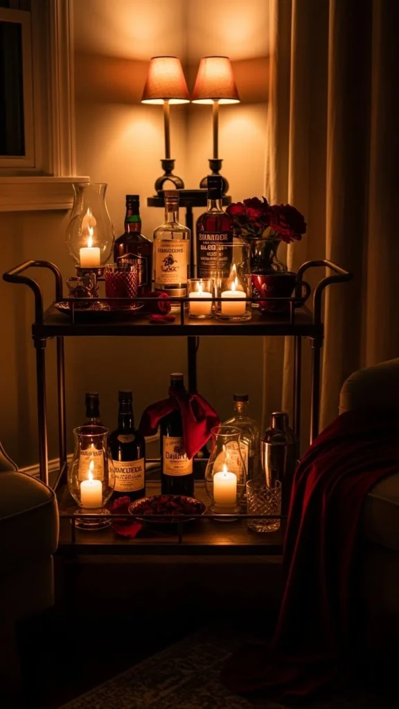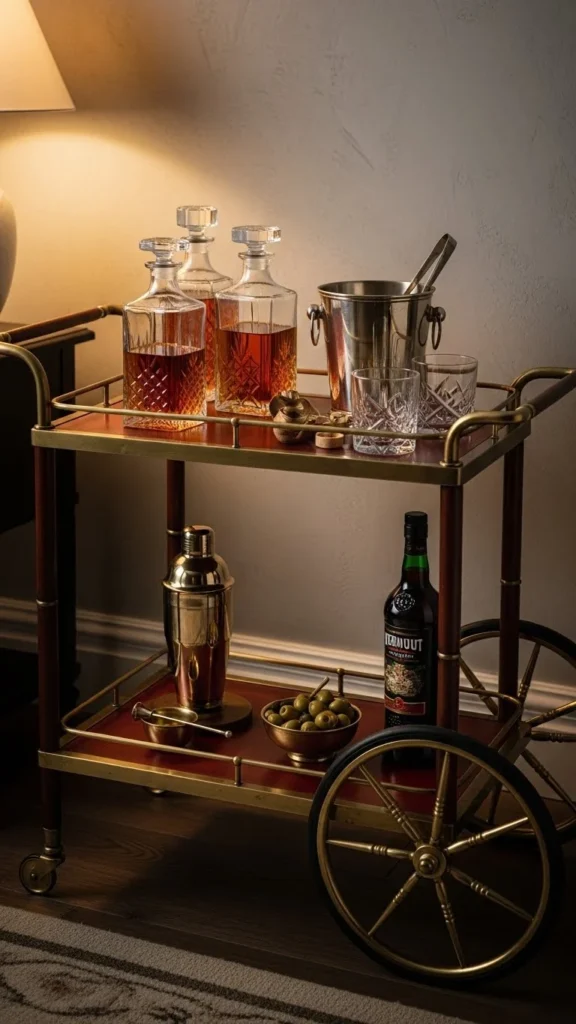 This setup is all about mood, not quantity. Choose darker bottles and limit shine. Soft lighting sets the tone better than extra objects. Place candles behind the cart so glass catches glow instead of glare. Use linen or matte paper napkins to absorb light. Keep garnishes minimal and prepped. This cart works well for late evenings and quiet gatherings.