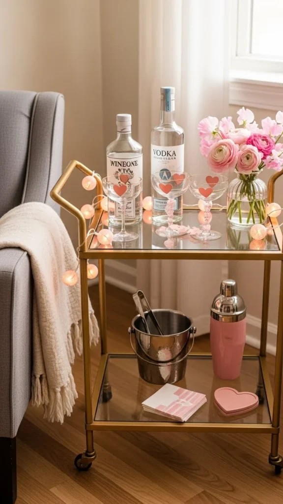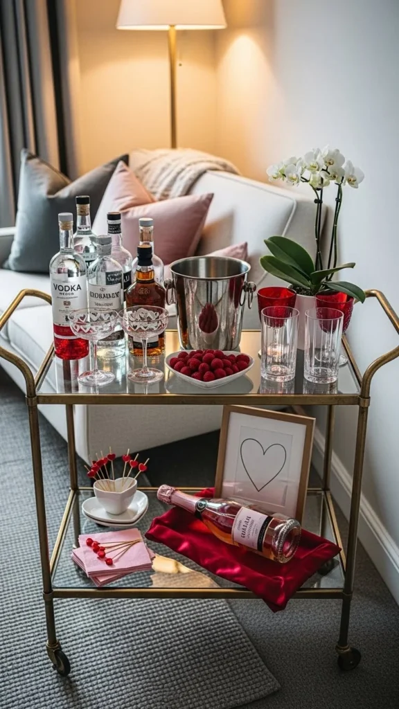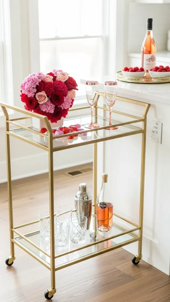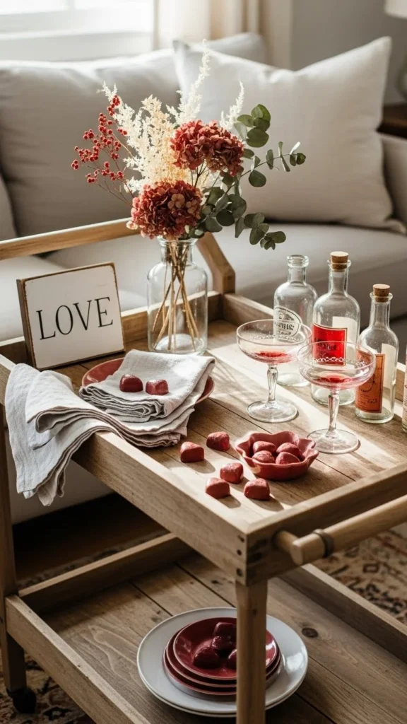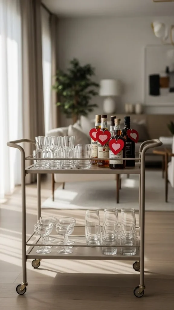 Heart details can work when they’re kept minimal. Pick one heart shape and repeat it twice only. Small accents keep the look tasteful. Think paper tags, coasters, or a single dish. Balance pink or red with clear glass and wood. If the cart feels busy, remove one shelf item right away. DIY idea: cut hearts from cardstock and tie them to bottle necks with twine. This cart suits casual gatherings and feels playful without overwhelming the room.