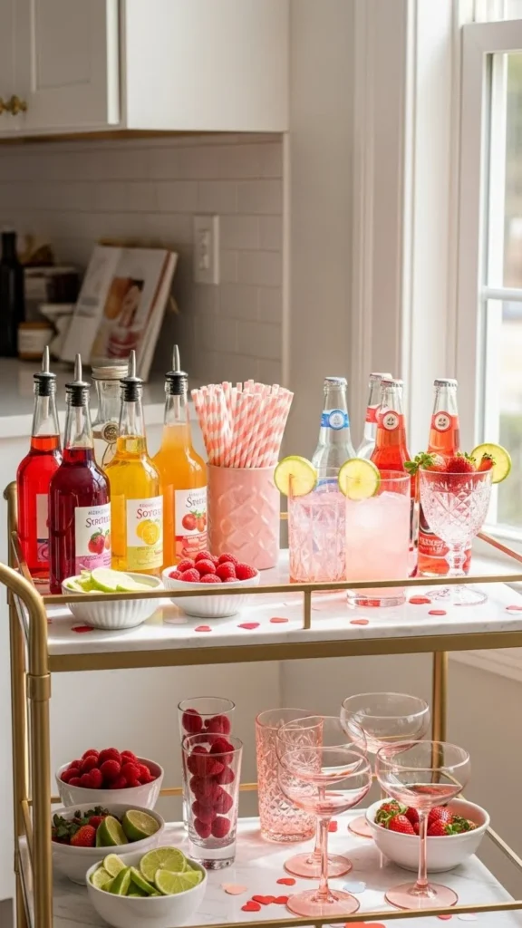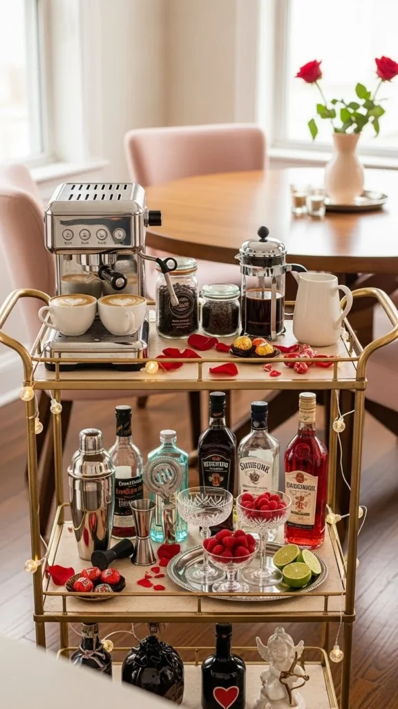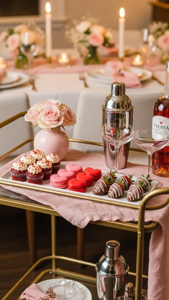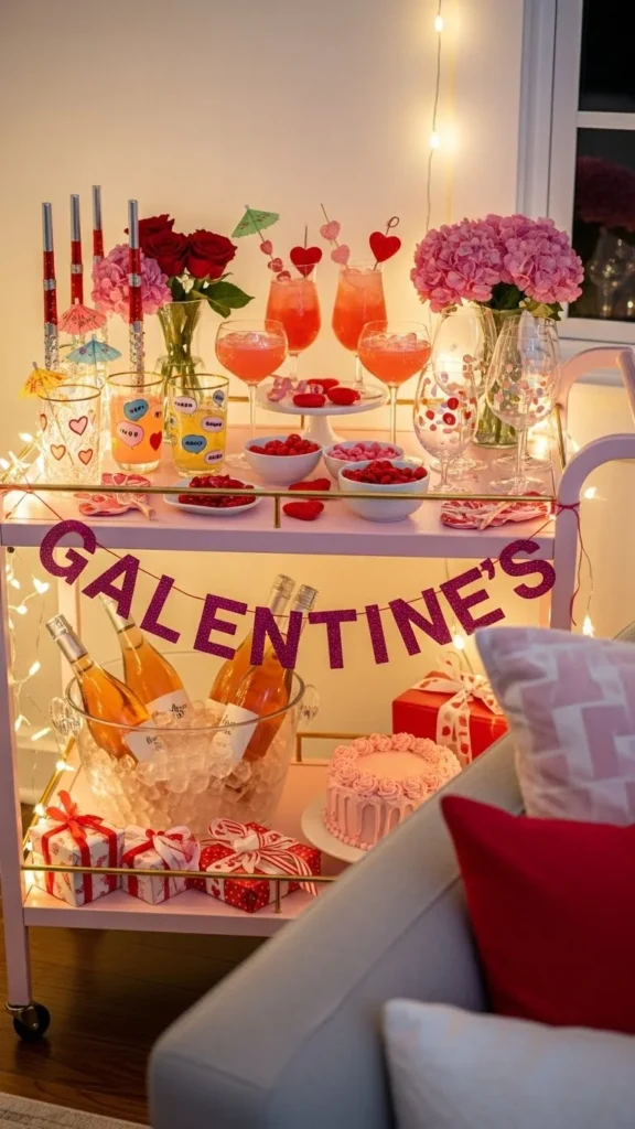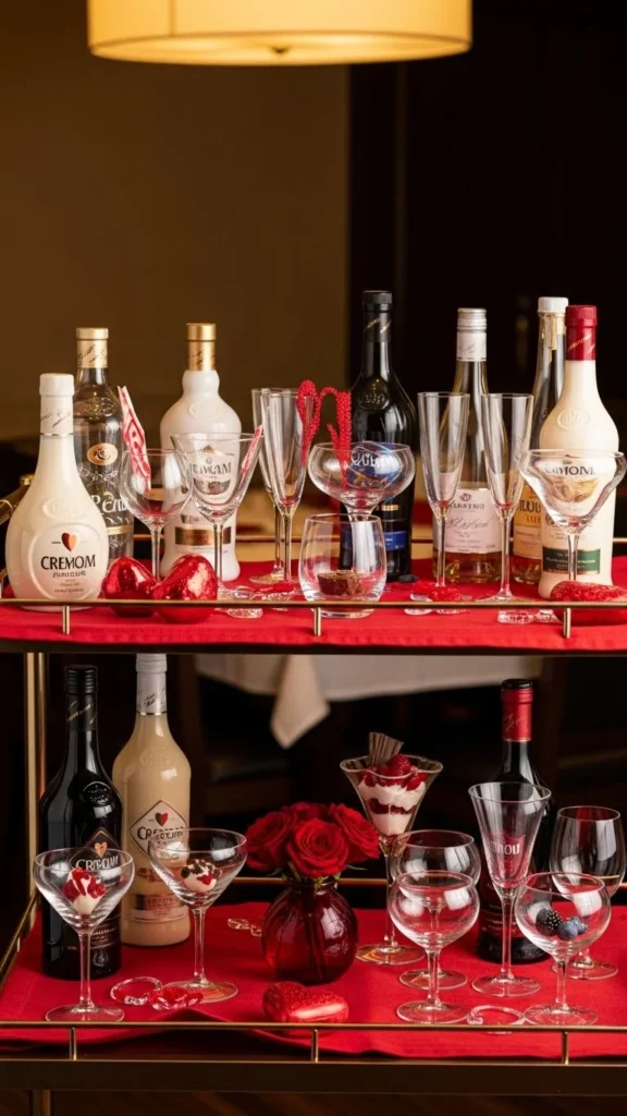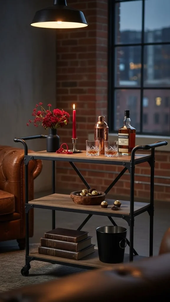 Heart details can work when they’re kept minimal. Pick one heart shape and repeat it twice only. Small accents keep the look tasteful. Think paper tags, coasters, or a single dish. Balance pink or red with clear glass and wood. If the cart feels busy, remove one shelf item right away. DIY idea: cut hearts from cardstock and tie them to bottle necks with twine. This cart suits casual gatherings and feels playful without overwhelming the room.