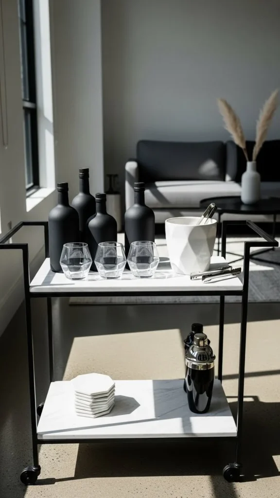A black-and-white bar cart feels sharp and calm at the same time. Stick to one base color and repeat it across bottles, napkins, and trays. High contrast keeps the cart readable from across the room. If bottles don’t match, decant spirits into clear glass for a cleaner look. Use white coasters to break up darker surfaces. DIY tip: wrap mismatched labels with removable white paper bands. Keep garnishes simple, like lemon twists or black cherries, stored in small jars. This cart works well in modern spaces where color already comes from furniture or art.