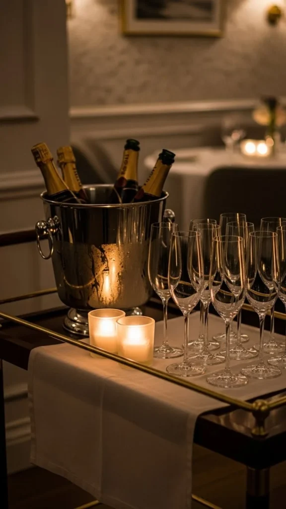 Champagne feels special on its own, so let the cart stay light and airy. Focus on glass shapes and glow rather than extra objects. Candle clusters create intimacy without taking space. Choose slim tapers or battery votives to keep hands safe while pouring. If you don’t own an ice bucket, use a clear bowl nested in a tray. Add sugar cubes and citrus peels for guests who like custom pours. Keep napkins folded vertically so they’re easy to grab. This setup shines in the evening and works well for last-minute hosting.