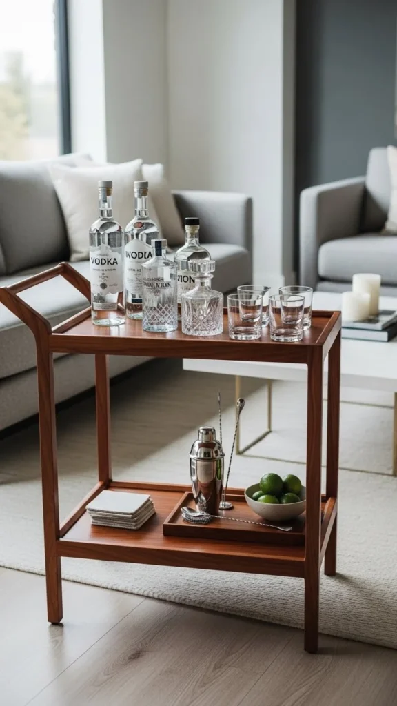 Small spaces call for tight edits. Limit yourself to one tray per shelf. Scale matters more than quantity. Use vertical storage for glasses and keep mixers chilled elsewhere. This approach keeps the cart useful and calm.