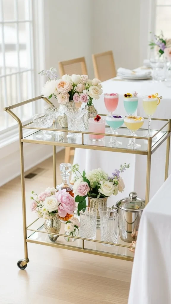 A mocktail cart makes everyone feel included. Use clear bottles so colors become décor. Bright liquids double as styling tools. Add recipe cards in simple frames. Keep garnishes prepped to save time during serving. Budget tip: reuse jam jars for syrups. This setup works well for daytime events and family-friendly gatherings.