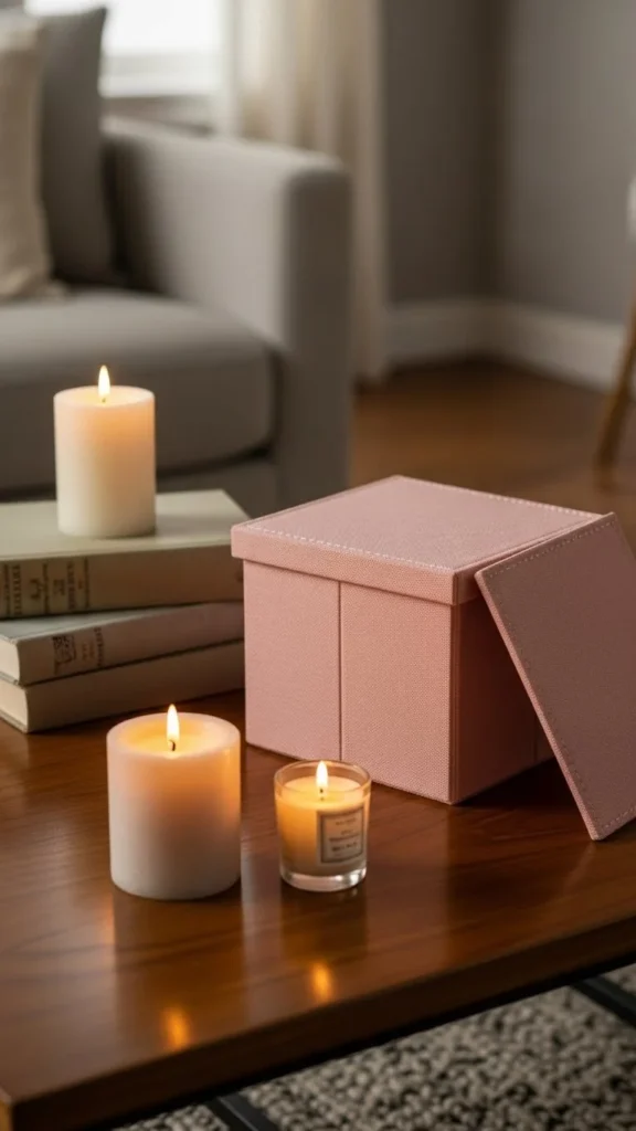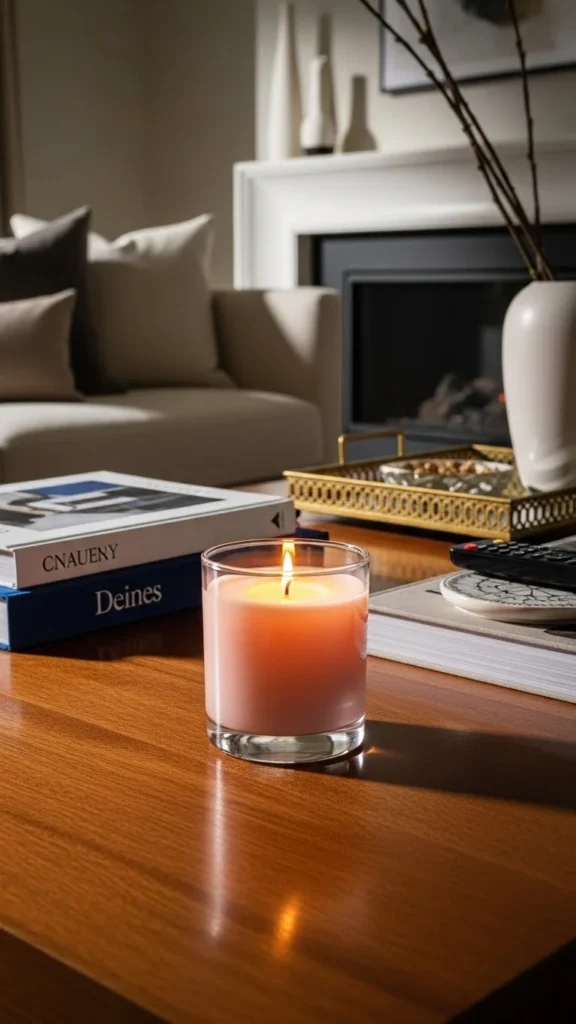 A candle with a gold rim brings warmth and a hint of shine. Keep scent light so it doesn’t overpower the room.
