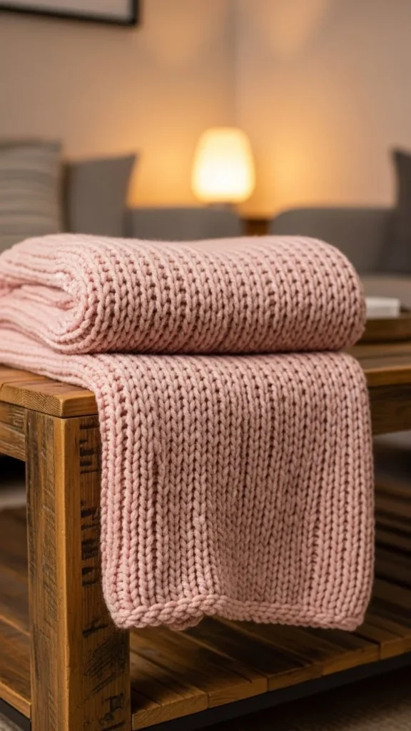 A folded throw near the table adds softness and function. Blush knit ties into Valentine tones gently.