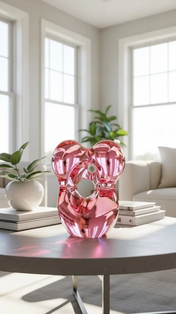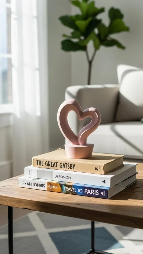An abstract sculpture with a heart-inspired curve adds interest without feeling literal. Matte finishes keep it grounded and calm. Choose compact sizes so it doesn’t overpower the table.