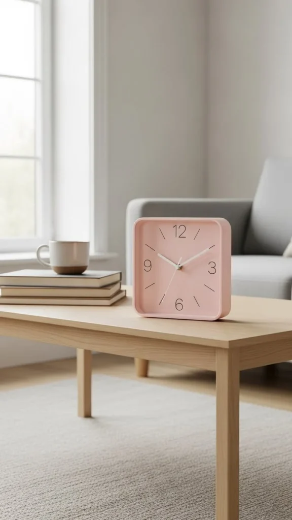 A small clock adds interest and purpose. Pink casing keeps it seasonal.