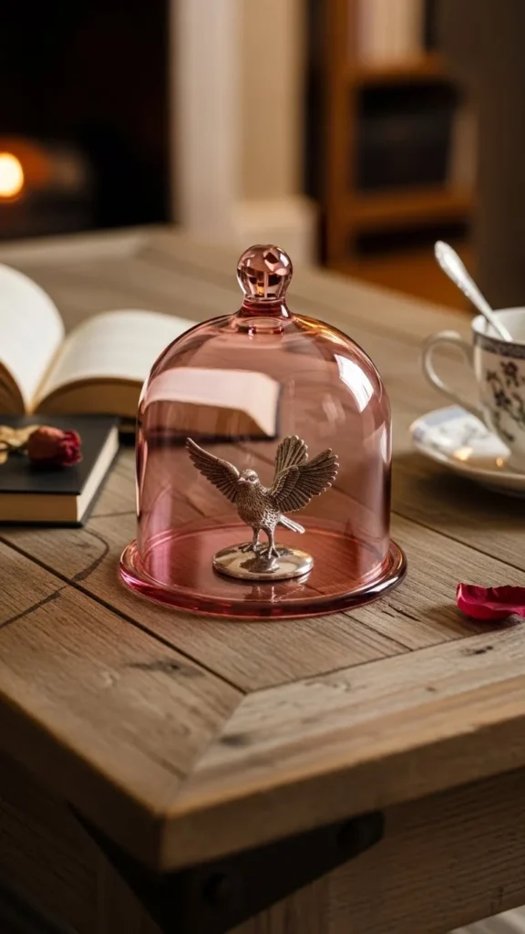 A cloche creates focus and protects items. Pink glass adds color softly.