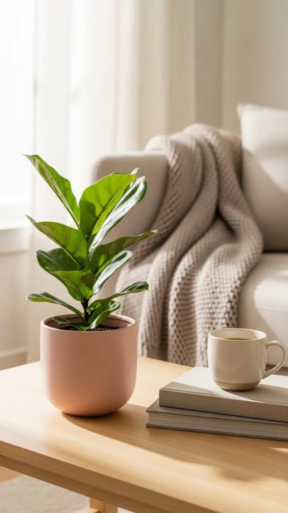A small plant brings life to the coffee table. A pink-toned pot ties into Valentine color without dominating the space. Stick to simple shapes with matte finishes for a calm look.
