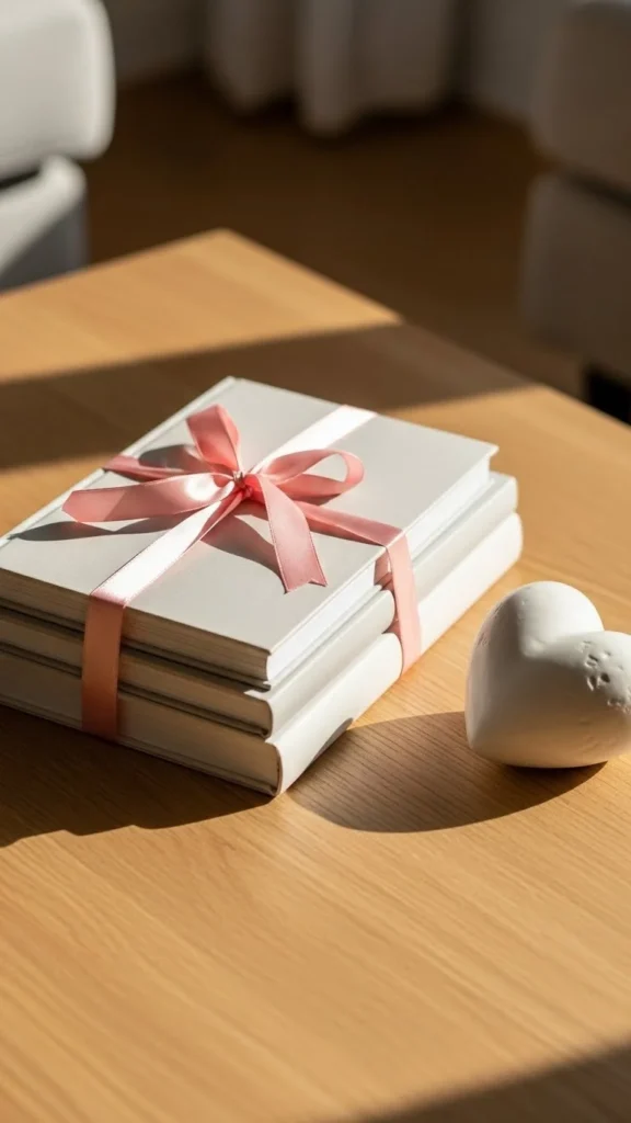 Books ground a coffee table and give structure. Adding a ribbon introduces simple seasonal detail without clutter. Choose neutral covers so the pink accent stands out gently.