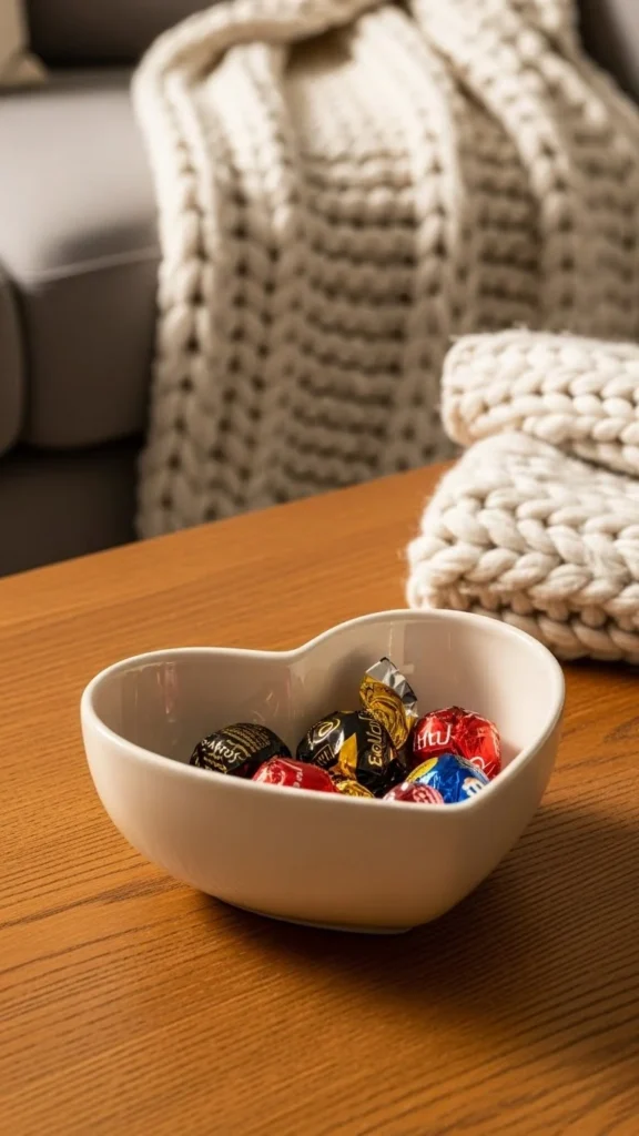 A ceramic heart bowl adds charm while staying useful. Fill it with wrapped treats, mints, or even keys. The matte finish keeps it from feeling shiny or decorative-only.