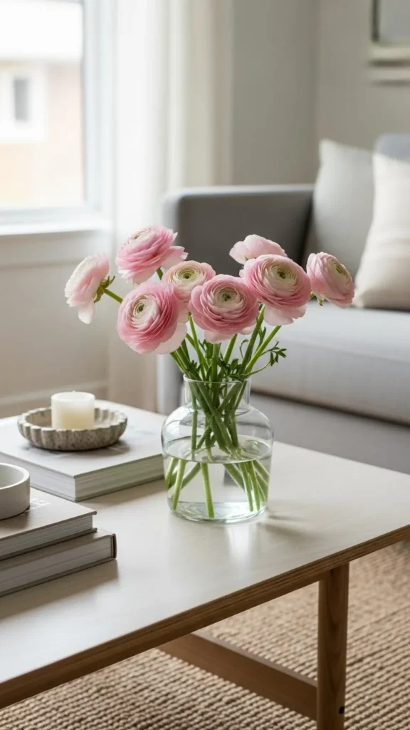 A low floral arrangement brings life without blocking views. Clear glass keeps things light and easy. Stick to one flower type for a calm look.