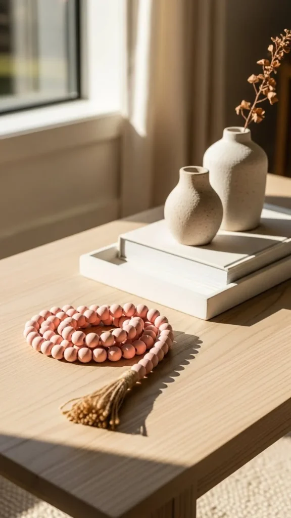 Decorative beads add movement and texture. Soft pink wood keeps the look calm. Let them drape naturally instead of forming a tight circle.