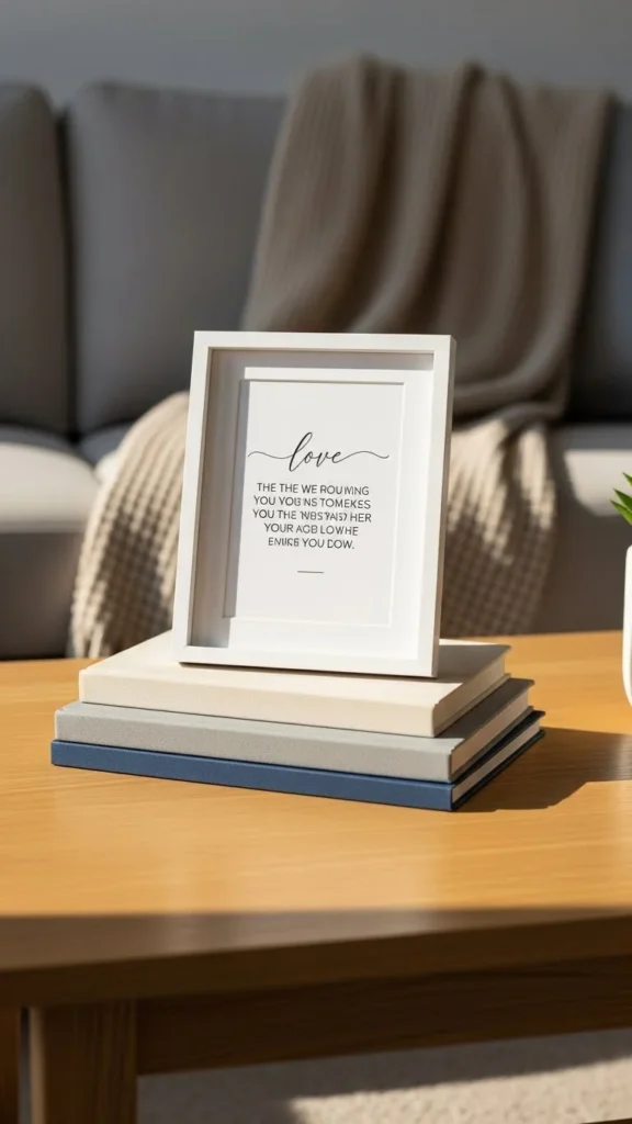 A small frame leaning on the table adds personality without hanging anything. Choose a simple quote with clean typography.