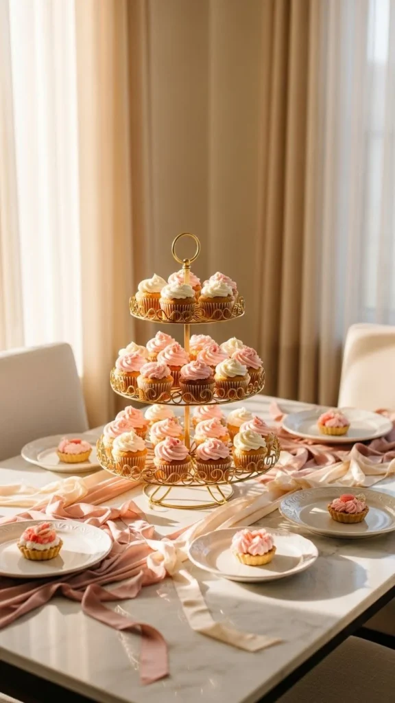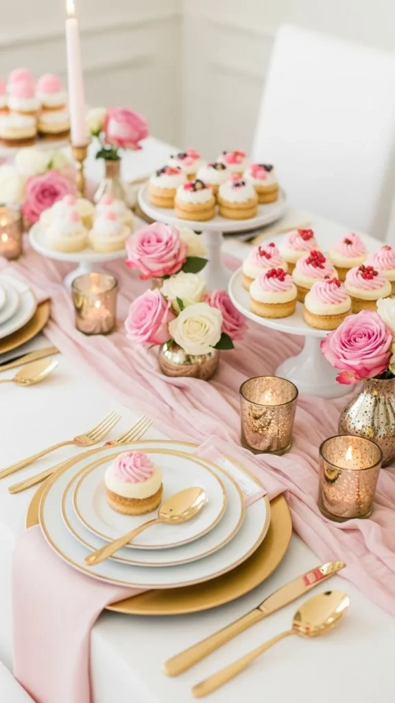 This setup works beautifully when you want height without clutter. A tiered stand draws the eye upward and keeps the table feeling light. Use simple vanilla cupcakes and tint the frosting with a touch of pink food color. Gold spray paint can transform thrifted stands. Balance the shine with matte plates or linen runners. Keep spacing loose so each dessert has room to breathe. Add small heart toppers cut from cardstock for a sweet handmade detail. If space is tight, place the stand slightly off-center and fill the other side with flowers. Mixing homemade desserts with bakery treats saves time and money. Stick to two main colors so the table feels calm and intentional. Soft lighting from a nearby lamp creates a cozy glow guests naturally gather around.