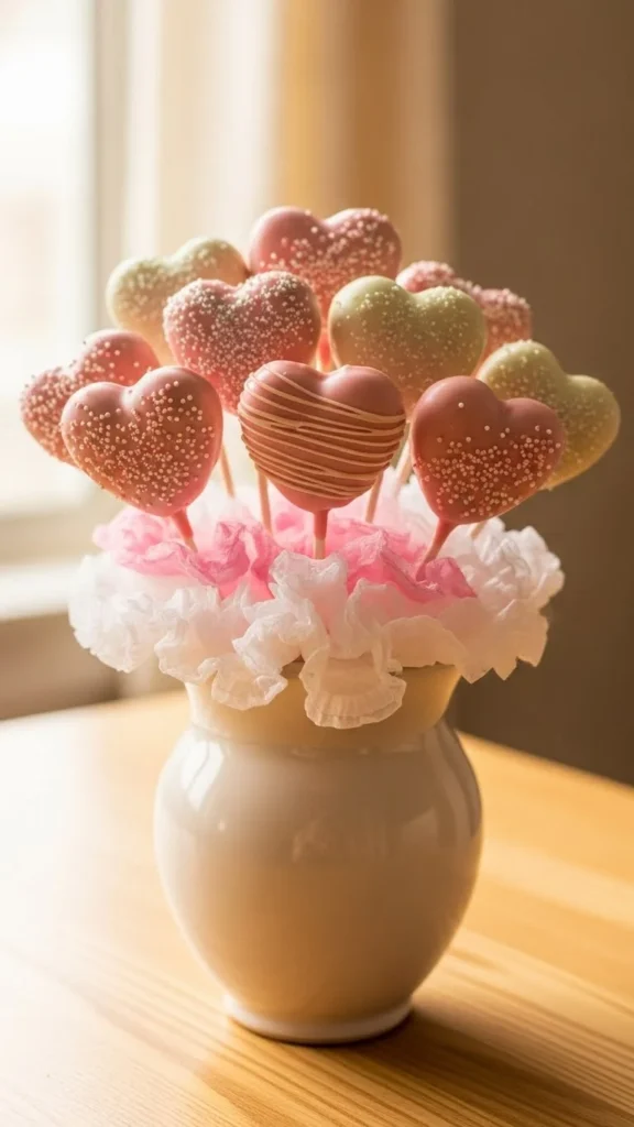 Cake pops are small but eye-catching. Stick them into foam hidden inside the vase. Use tissue or fabric scraps for filler. Keep decorations light so shapes stay clear. This works well as a table centerpiece or side display. Guests can grab one without plates. Making them ahead reduces day-of stress. The bouquet style adds playful charm without taking much space.