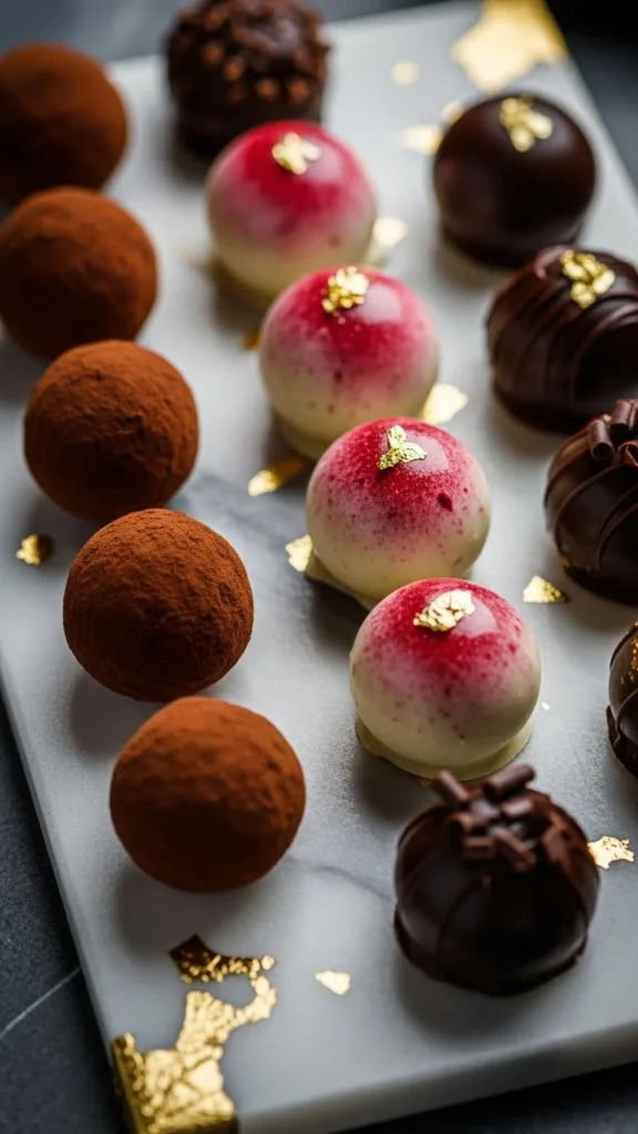 Truffles feel rich and thoughtful. Space them evenly to avoid clutter. Mixing textures keeps the board visually interesting. Add small paper cups for serving. This setup suits evening gatherings and couples’ dinners. Keep flavors labeled so guests know what they’re choosing. Marble surfaces make colors pop and feel special. It’s a quiet luxury look that’s easy to pull off.