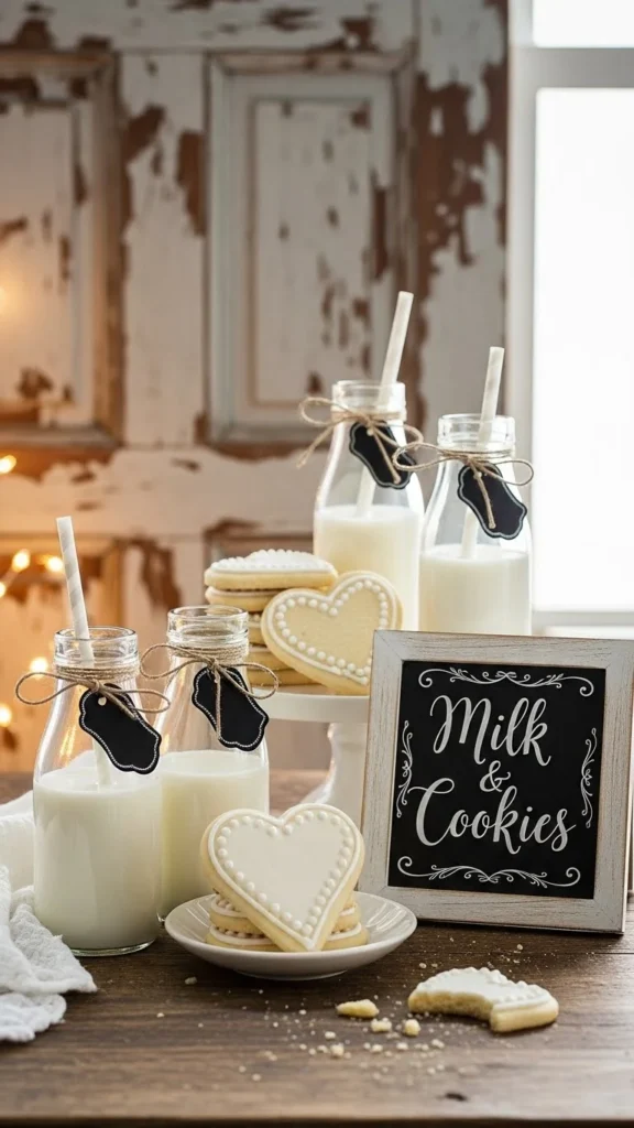 This idea feels nostalgic and welcoming. Use different cookie flavors for variety. Offer dairy-free milk options too. Keep bottles chilled in a small crate with ice packs underneath. This station invites guests to pause and relax. It’s especially great for family-friendly events. The setup feels comforting and familiar, making everyone feel at ease.