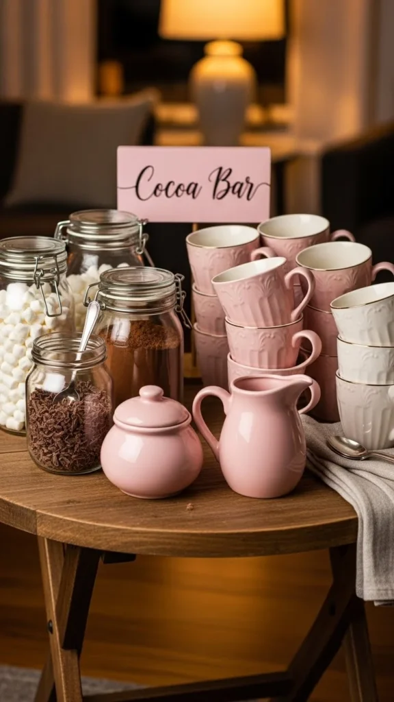 Warm drinks pair nicely with sweets. Keep cocoa warm in insulated dispensers. Offer toppings in clear jars for visual order. This bar feels inviting during evening events. It encourages guests to linger. The setup creates a cozy pause in celebration.
