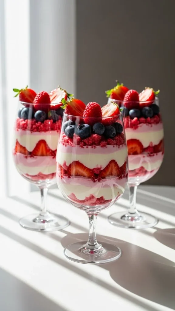 Parfaits add height and transparency to a dessert table. Use clear glasses so layers stay visible. Keep portions small so guests can sample more than one treat. Alternate textures like creamy, crunchy, and juicy for balance. This dessert is easy to prep earlier in the day. Cover with plastic wrap and chill until serving. Use frozen berries if fresh ones are expensive. Arrange glasses in staggered rows to avoid a stiff look. The layers create gentle visual interest without extra decor. This option feels lighter than heavy baked sweets.