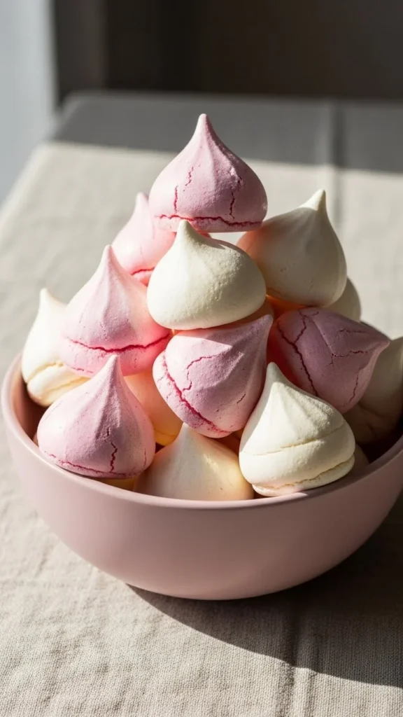 Meringues add airiness to a dessert spread. Their light weight and crisp texture contrast heavier sweets. Use a large bowl so they feel abundant. Tint them lightly for a soft look. Avoid overcrowding so shapes stay visible. These can be baked days ahead and stored dry. They’re budget-friendly and low effort once you get the hang of piping. The bowl acts as a soft filler element that completes the table without drawing too much attention.