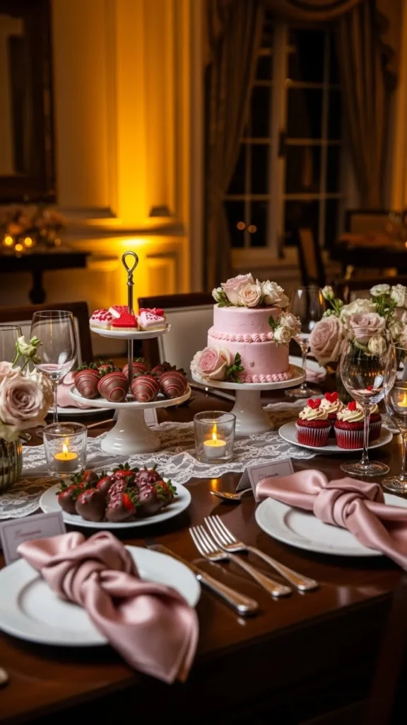 Lighting changes everything. Adding candles instantly softens the table and makes desserts look more inviting. Use low holders so sightlines stay clear. Keep flames away from food edges. This idea works with any dessert mix and brings everything together visually. Choose warm bulbs or candles for a cozy tone. The glow encourages guests to linger and chat. It creates a romantic finish that feels thoughtful without extra cost. This final touch often leaves the strongest impression.