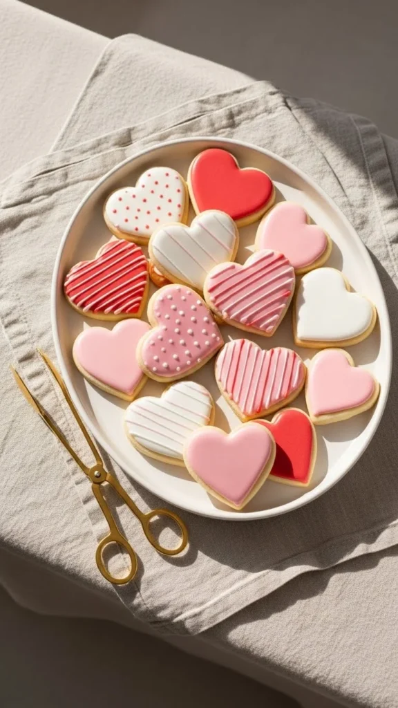 Sugar cookies are familiar and comforting. Using heart cutters keeps the theme clear without going overboard. Royal icing can be tinted in soft shades for a calm look. For a shortcut, buy plain cookies and decorate only a few as statement pieces. Stack them slightly overlapping for a casual layout. Add a small bowl of sprinkles nearby so guests can decorate their own. This turns the tray into a fun interactive moment. White platters help colors stand out. If you want less sugar overload, mix in shortbread or butter cookies. Keep napkins close so crumbs don’t travel.
