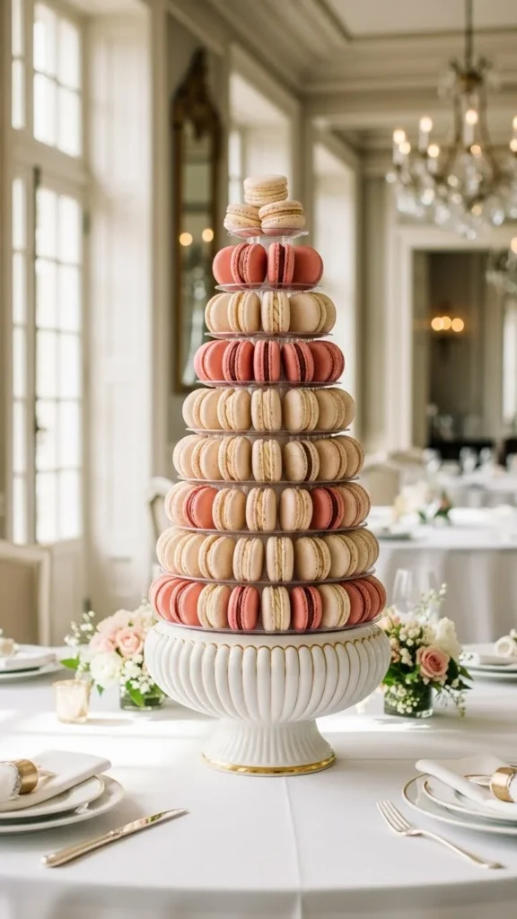 Macarons bring instant charm. A tower creates a focal point without extra props. If bakery macarons stretch the budget, mix real ones with faux fillers on the lower tiers. Keep colors soft to avoid visual noise. Surround the base with rose petals or small candles. Guests naturally gravitate toward the center, making serving easy. This works well for couples’ parties or formal dinners. Use a neutral tablecloth so the colors stand out. The height adds drama while keeping the table surface open. It’s a polished look that doesn’t feel heavy when styled simply.