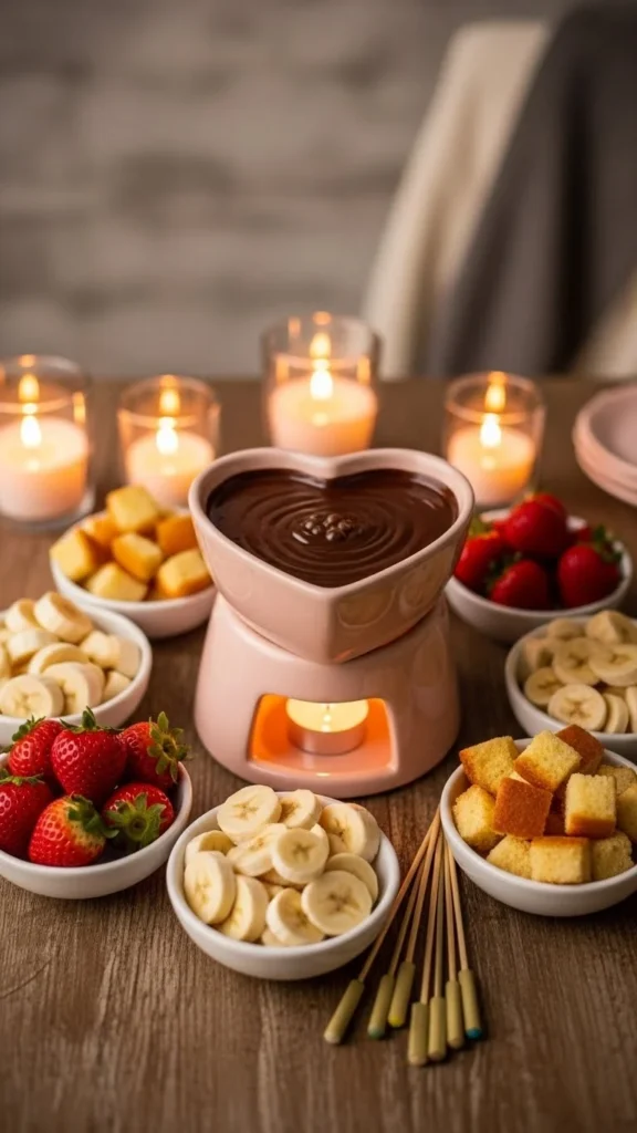 Fondue turns dessert into an activity. Use a small electric pot for steady heat. Arrange dippers in bowls of different heights. Keep flavors simple so chocolate stays the star. Pound cake from the bakery counter works perfectly. Add parchment under bowls to catch drips. This station feels indulgent yet relaxed. It encourages guests to slow down and chat. For easier cleanup, use wooden skewers and paper napkins. This setup creates shared moments without complicated prep. Keep extra chocolate nearby for refills.