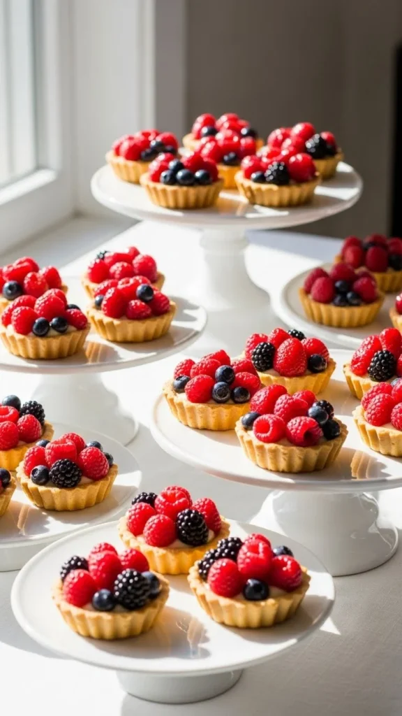 Berry tarts feel elegant yet simple. Use premade tart shells to save time. Fill with vanilla custard or cream cheese filling. Arrange tarts in odd numbers for a natural look. White stands keep the focus on color. Add greenery for contrast. This setup suits daytime events and brunch-style celebrations. It looks detailed without being busy. Highlighting natural colors keeps the table calm and inviting.