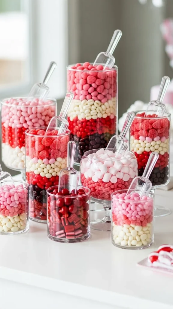 Candy jars are easy crowd-pleasers. Choose two or three colors only. Fill jars to different heights for rhythm. Use labels if flavors vary. This table works especially well with kids or casual parties. Buy candy in bulk and reuse jars later. The clean layout keeps things organized. It’s a simple win for busy hosts who want impact without baking.
