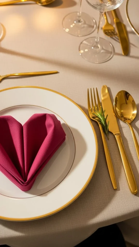 Heart-shaped napkin folds add charm without buying anything new. Use cotton or linen napkins for easier folding. Choose neutral colors so the shape stands out. Plenty of simple folds work well. Small details matter when repeated at each place. After the meal, unfold and wash as usual. Easy win.