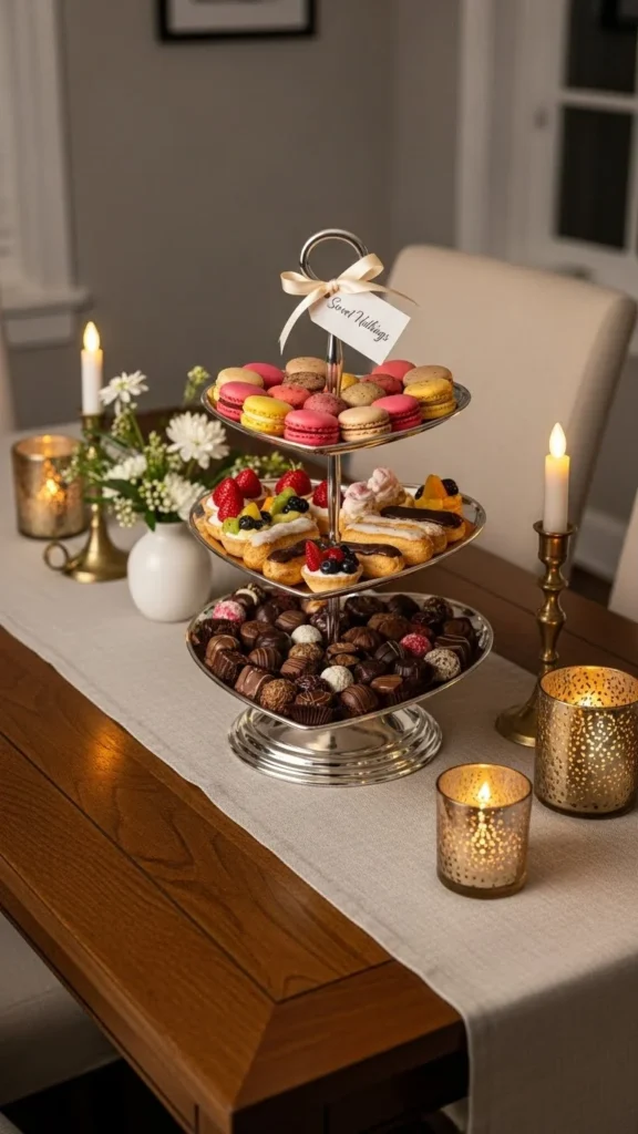 A dessert stand brings focus to sweets without crowding the table. Heart shapes feel festive but contained. Use it on a sideboard if space is tight. Dedicated dessert zones keep the main table clean. Reuse the stand for other celebrations.