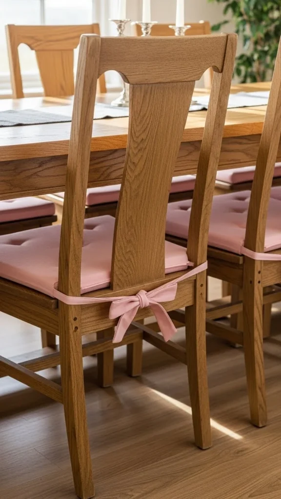 Chair cushions change the look without permanent changes. Stick to muted pinks. Ties keep them secure. Comfort plus style always works. Store them flat after use.