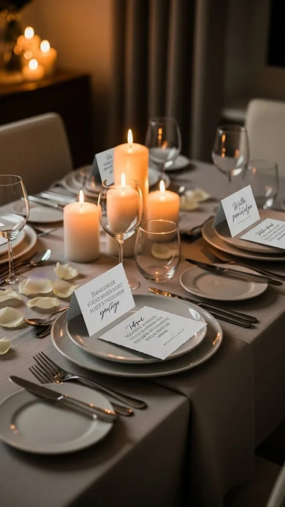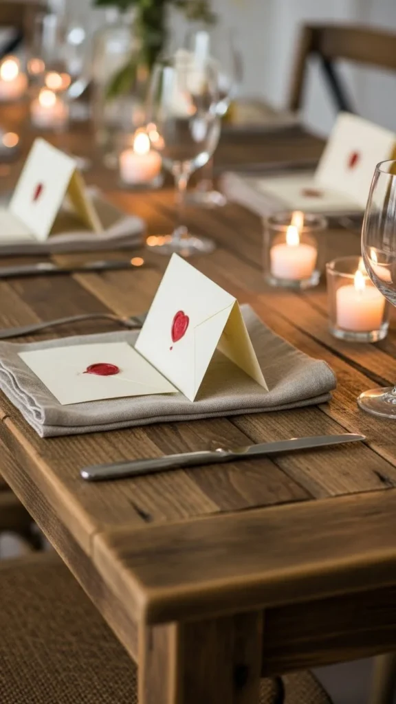 Place cards shaped like love letters add a thoughtful detail guests remember. Use cream or kraft cardstock for a soft, old-fashioned feel. Handwrite names with a simple pen. No calligraphy pressure here. Fold each card like an envelope and seal with a wax sticker or heart sticker. If wax feels tricky, use red paper dots. Place cards help the table feel styled even for small dinners. Pair them with neutral napkins so they don’t compete visually. Small paper details often cost very little but add meaning. After dinner, guests can take them home as keepsakes. You can also write short notes inside for a personal touch. Keep the rest of the table calm so these stand out naturally.