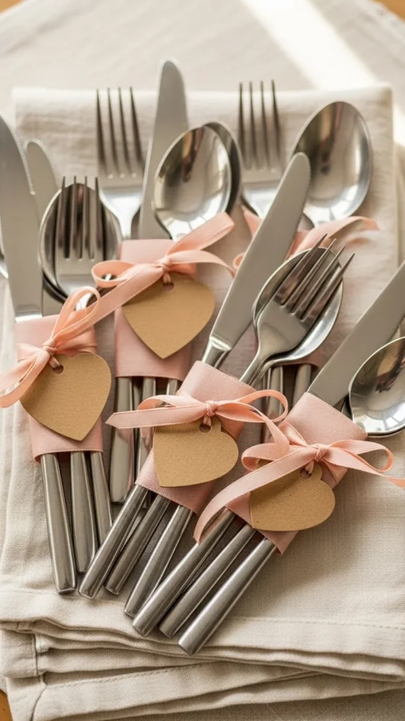 Ribbon-wrapped cutlery feels gift-like. Use fabric ribbon instead of plastic. Keep colors muted. Simple wrapping adds charm fast. Reuse ribbons later.