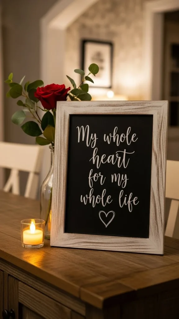 Chalkboard signs feel personal. Write a short message or date. Place it away from food. Handwritten details feel warm and real.